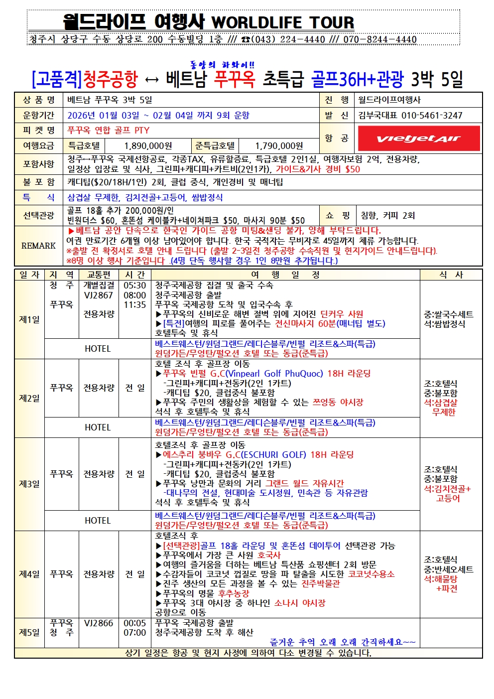 청주공항 푸꾸옥 럭셔리골프 세계1등 휴양여행지로 선정된 베트남 푸꾸옥직항 2026년1월도 최적시즌 진행 단9회 특별전세기 진행기회 전국예약센터 월드라이프여행사 김부국대표 010 5461 3247