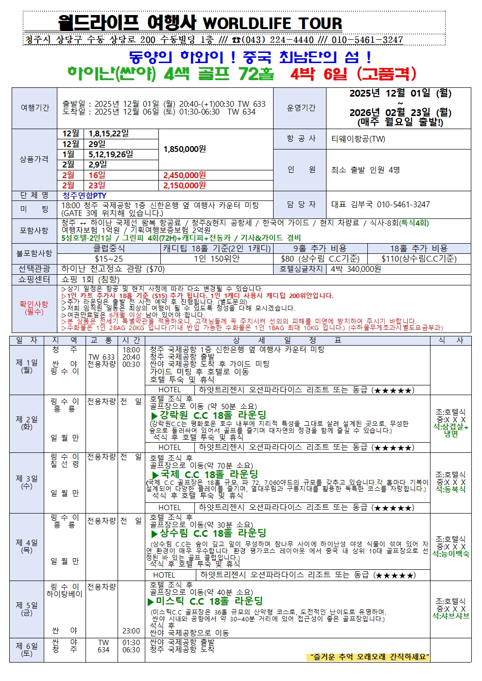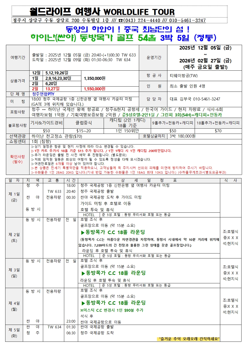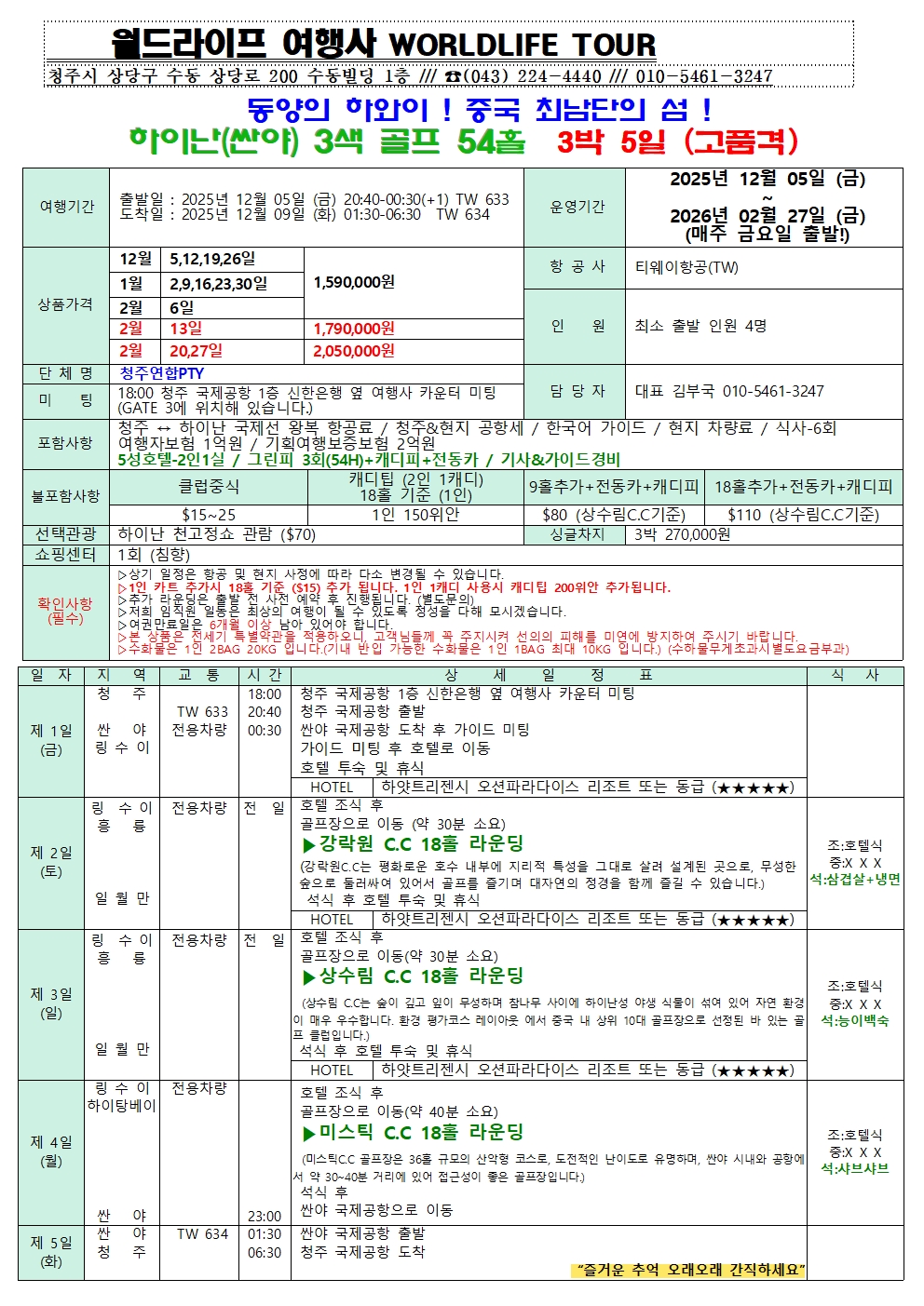 청주공항 하이난 최적시즌 12월 2026 1.2월 CJB문화탐방 검증된 명문 3-4색골프 & 강락원 특급 럭셔리 골프 동계 최고인기 골프투어 전국예약센터 월드라이프여행사