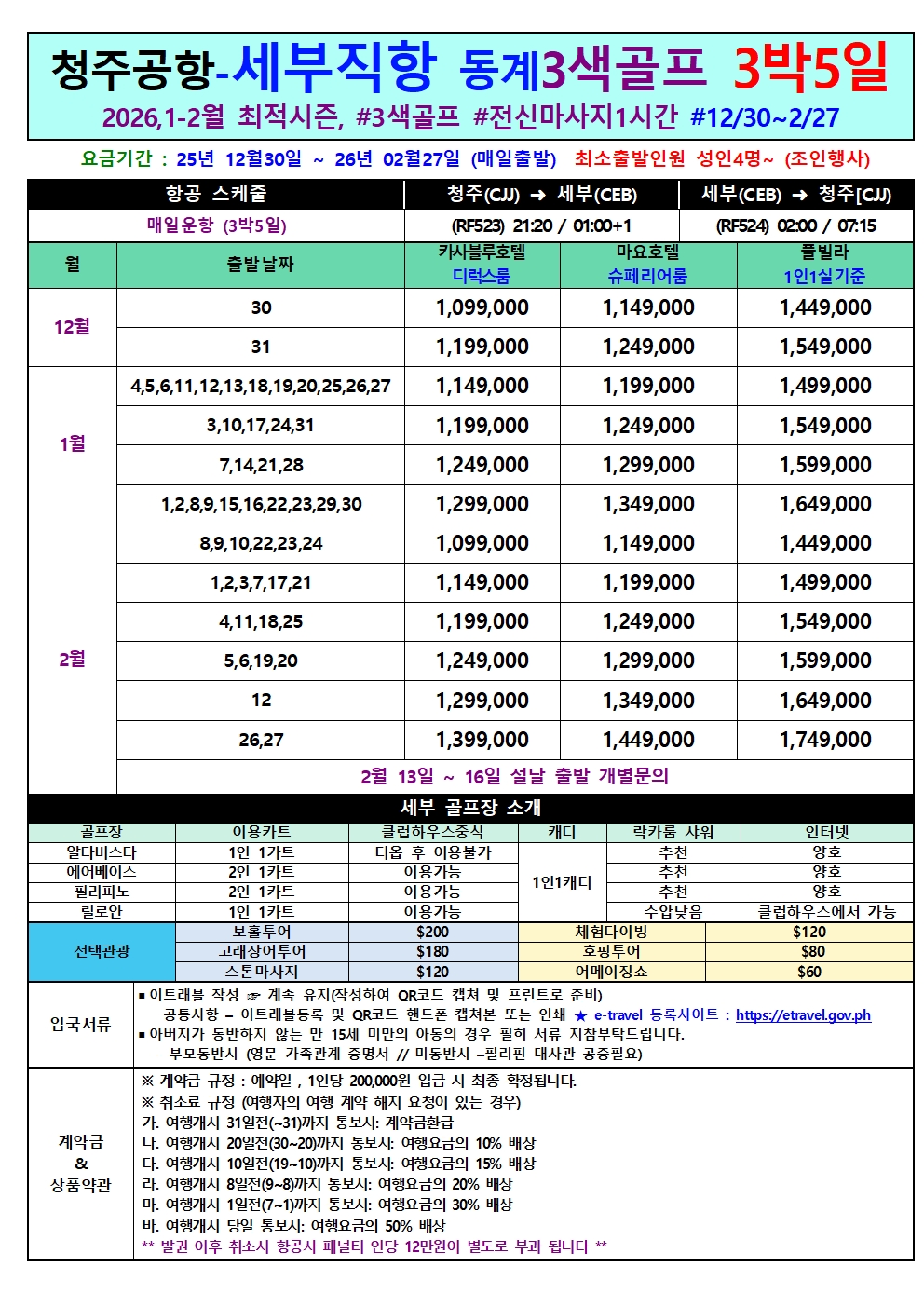 청주공항 아름다운 휴양힐링 천국 세부 명품 3색 럭셔리 가성비 최상급 보장 골프 2026년 1-2월도 최적시즌 라운드 진행