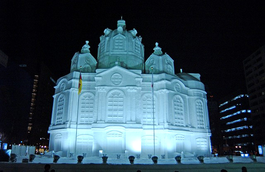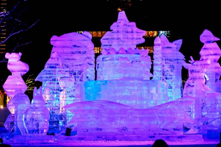 Susukino 구역에서는 ‘Ice World’라는 테마 아래 약 60개의 얼음 조각이 설치되며 밤에는 조명 연출이 화려합니다.