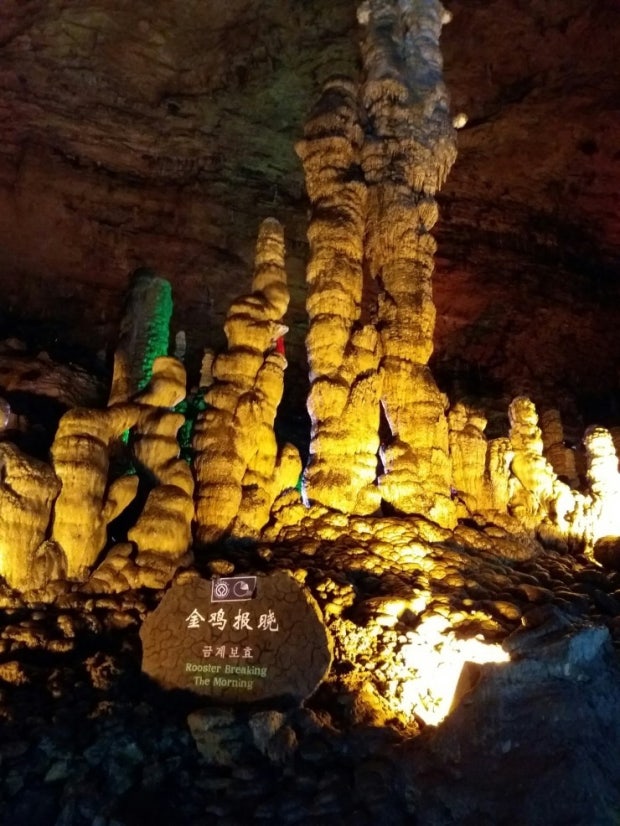 옛날 이곳에는 황룡이 살았었는데 백성들이 기름을 갖다 부어서 쫓아냈다는 전설도 있다. 동굴 안의 세계는 그야말로 거대한 지하 별세계를 이루고 있어 동굴 안으로 들어갈수록 아름답고 고요한 절경이 극치의 경지에 이르는 것 같았다. 천여 개의 석봉과 석주는 마치 석림(石林)과도 같은 대장관을 이루고 있었고 정해신침(定海神針)이라는 가장 멋있고 높은 석순은 높이가 무려 19.2m에 달하고있으며 현재도 계속 커가고있다.