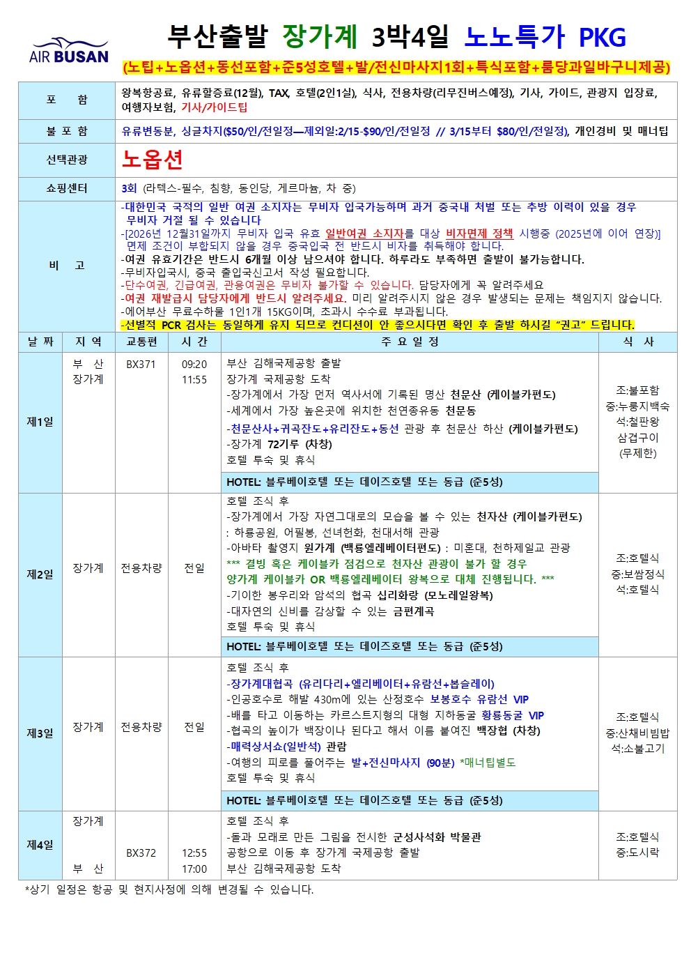 인천공항 동계시즌 장가계 여행일정표 안내