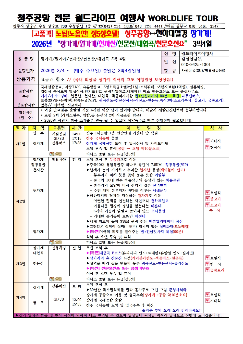 청주공항 대절경 장가계 여행 2026년도진행 장용항공(기내식포함) 최상급 5성특급호텔