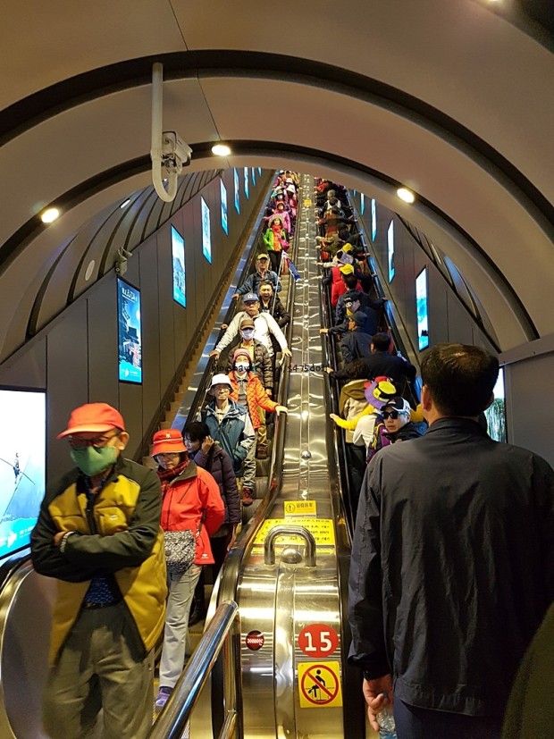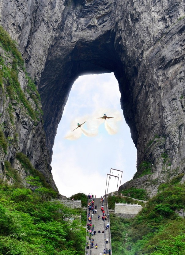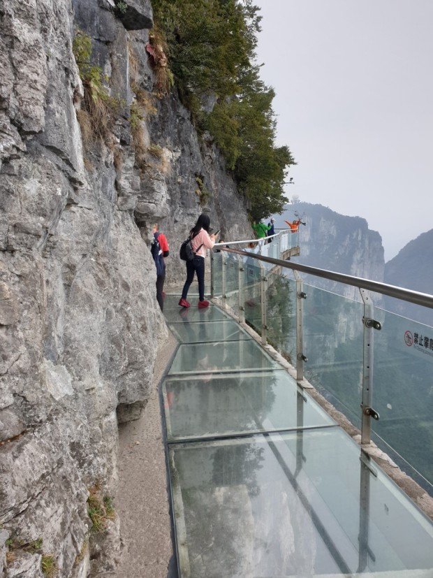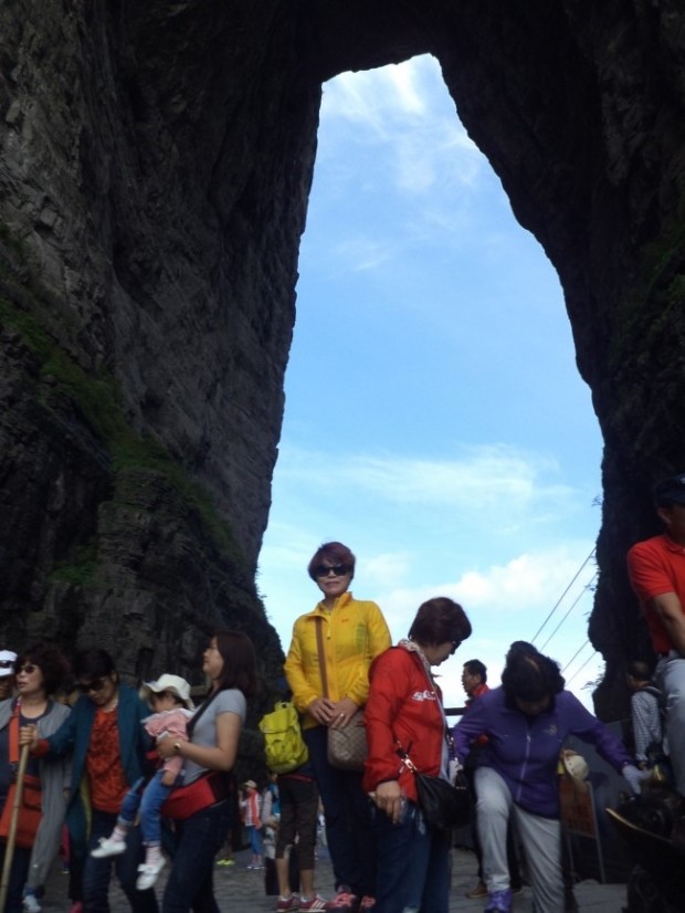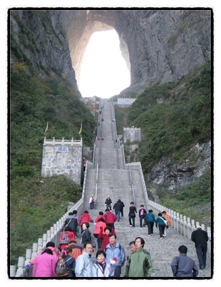 천문산의 천문동은 999계단으로 전에는 앞쪽에서 걸어 올라갔으나 지금은 뒤쪽으로 케이블카를 타고 올라가 절벽잔도를 1시간30분정도 걸으며 놀라운 파노라마 경관을보고 구멍뚤ㅇ림 천문동 뒤쪽에서 인생샷을 찍고 소원성취기도를 한후, 최근 내려오는 땅굴속의 길을 에스컬레이터 7구간을 설치하여 편안하게 내려오도록 만들어 놓았다, 중국 여유국이 아니면 상상할 수 없는 놀랍고 경이로운 땅속에만든 백화점식 첨단 에스컬레이터라 할 것이다.