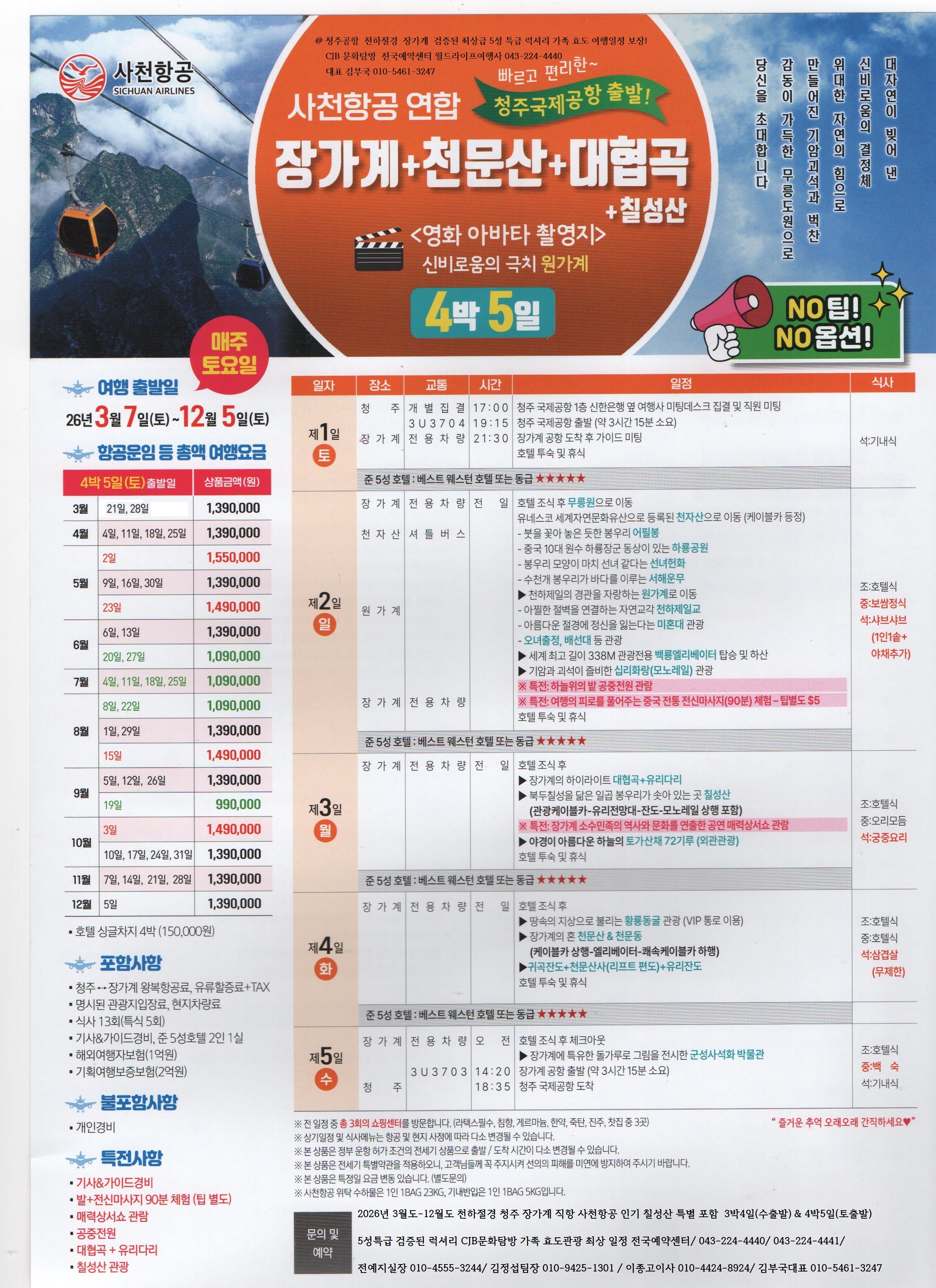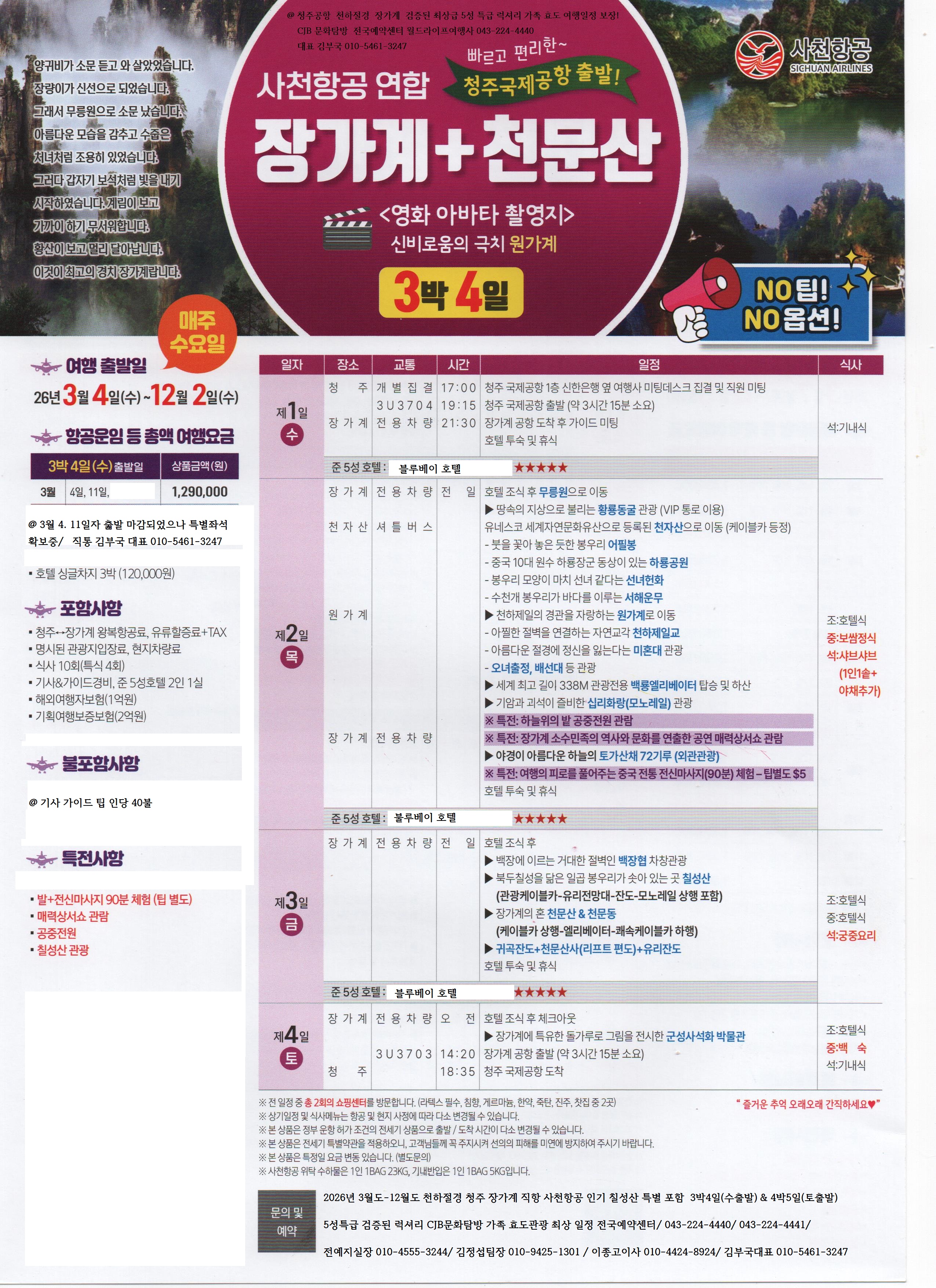청주공항 2026년 3월부터-12월도까지 진행 천하절경 무릉도원 장가계 (효도여행 럭셔리 끝판왕 검증된 CJB 문화탐방 일정) 사천항공 3월초중순마감종료되었으나 특별 좌석확보 예약진행중 안내 월드라이프여행사 043-224-4440