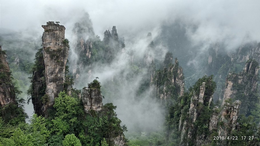 계곡을 따라 모노레일을 타고가는 동안 끝없이 펼쳐지는 절경에 경탄을 금치 못했다. 상상속에서나 볼수있는 갖가지 형상의 놀랍고 기막힌 형태의 봉우리가 무궁무진하게 이어지고 있었다. 상상을 초월하는 경치였다. 감탄과 감격으로 탄성이 절로나오는 절경은 이루 다 말로 설명할 수 없는 천혜의 경관이었다.